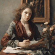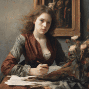 Νεαρή γυναίκα ζωγραφίζει σε ατμοσφαιρική γκαλερί, ανάμεσα σε έργα τέχνης και λουλούδια.